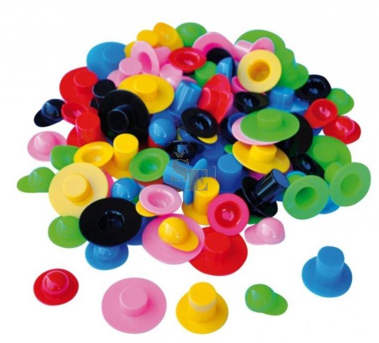 Různobarevné plastové kloboučky a kšiltovky - 48ks. Velikost od 2cm do 3,5cm. Barevný mix přímo od výrobce - nelze ovlivnit barvy.
