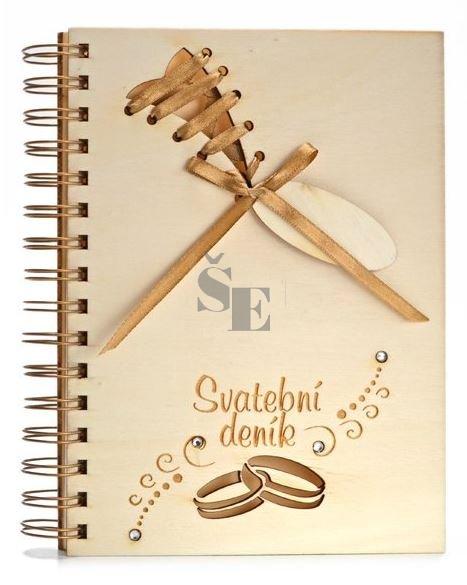motiv vyřezávaných prstýnků se třpytivými kamínky a výřez ve tvaru šněrovačky s hnědou lesklou stuhou
