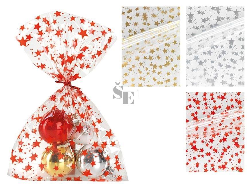 Vánoční průhledný celofánový sáček s motivem hvězd v červené, stříbrné nebo zlaté barvě. Vyrobený z luxusního celofánu s potiskem. Skvělý na zabalení drobných dárků. Sáček můžete uzavřít vázací stuhou a tím ho dozdobit.