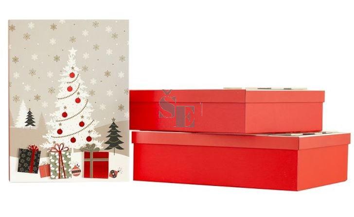 Krabičky jsou červené, víčko je ozdobené obrázkem a 3D aplikací v podobě dárečků.