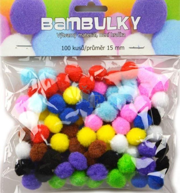 Balení obsahuje 100 ks bambulek v barvách - růžová, žlutá, sv. modrá, tm. modrá, hnědá, zelená, černá, bílá, fialová, červená