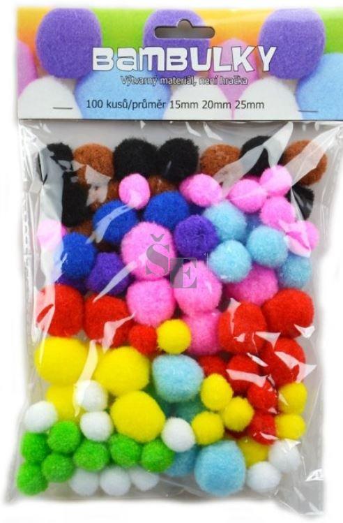 Balení obsahuje 100 ks bambulek v barvách - růžová, žlutá, sv. modrá, tm. modrá, hnědá, zelená, černá, bílá, fialová, červená
