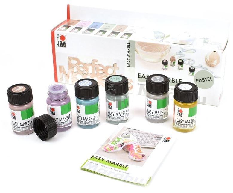 Barvy jsou ve skleněných nádobkách. Nádobu, která je větší než předmět, který chcete mramorovat naplňte vodou. Barvu nakapejte přímo z lahvičky na hladinu vody tak, aby byl celý povrch zakrytý. Poté špejlí vytvořte vzor. Nyní do hladiny pomalu ponořte předmět a rychle vytáhněte a nechejte důkladně proschnout.