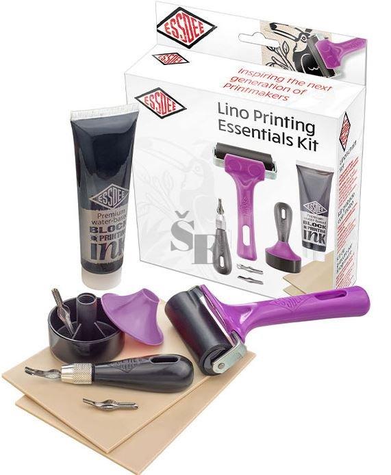 Sada pro linoryt obsahuje: 3 různá rydla, plastový držák s hliníkovou objímkou pro uchycení rydla,, 1x gumový váleček 6,5 cm s průměrem 3 cm, 1x černá barva na vodní bázi 100 ml, 2x lino (10 x 15 cm), 1x lino (7,5 x 4,5 cm), obrázkový návod.