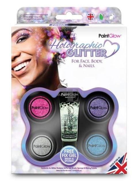 Balení obsahuje: třpytky ve čtyřech různých odstínech - balení 3g, fixační gel na třpytky - 13 ml, 2x štětce, paletu na míchání.