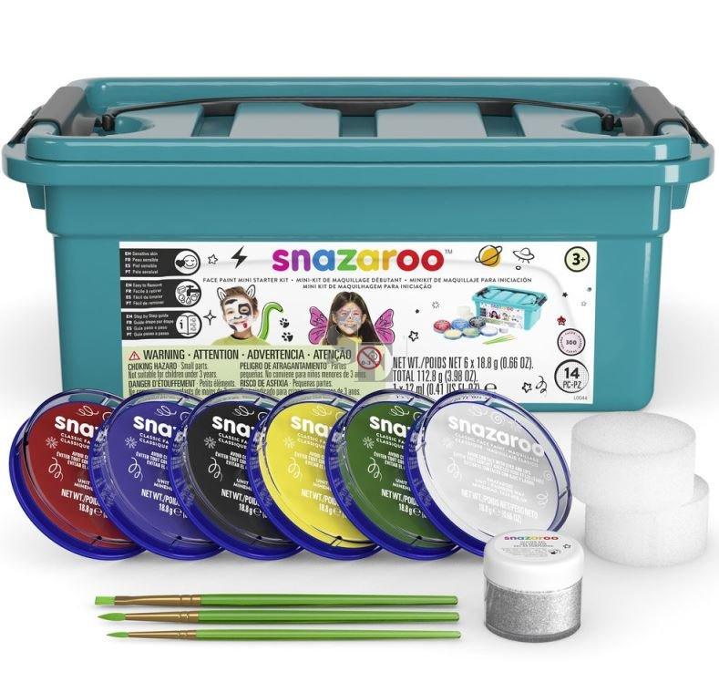 Balení obsahuje: 6 x 18 ml barev na obličej (červená, modrá, černá, zelená, žlutá, bílá, 2 x houbička, 3x štětec, 16 ml třpytivý gel stříbrný)
