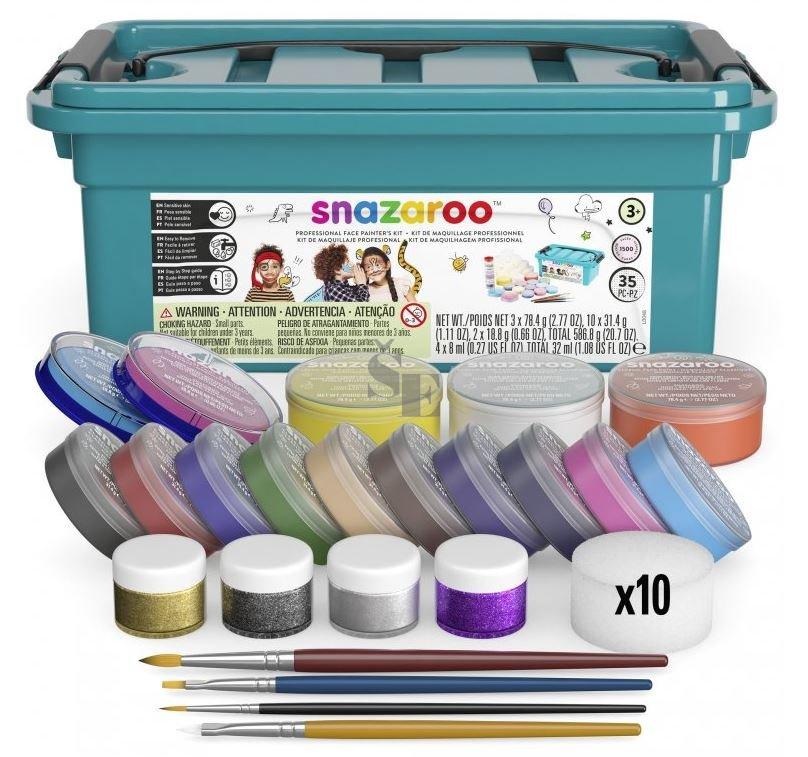 Box Profi SNAZAROO. Balení obsahuje: 3 x 75 ml barvy na obličej (bílá, oranžová, žlutá), 10 x 30 ml barvy na obličej (černá, červená, nebesky modrá, zelená, sv. hnědá, růžová, fialová, sv. šedá, tyrkysová, tm. růžová), 10 houbiček, 4 štětce na obličej, 1x tuba s gely (zlatý, stříbrný, růžová, holografická). Vše v praktickém boxu.