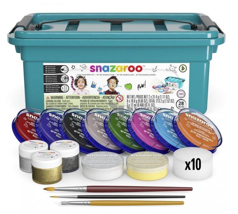 2 x 30 ml barvy na obličej (bílá, žlutá), 8 x 18 ml barev na obličej (červená, modrá, černá, růžová, zelená, sv. hnědá, tyrkysová, oranžová, 10x houbička, 3x štětec, 3 x 16 ml třpytivý gel (zlatý, stříbrný, holografický). Vše v plastovém boxu.