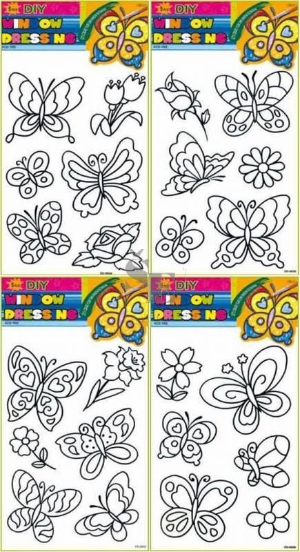 Určeno k vymalování buď barvičkami na sklo, akrylovými barvami nebo fixem - barevným popisovačem. Motýl