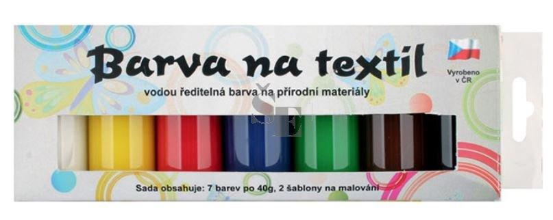 Sada vodou ředitelných barev na textil. Sada obsahuje 7 barev á 15 g a 2 šablony na malování
