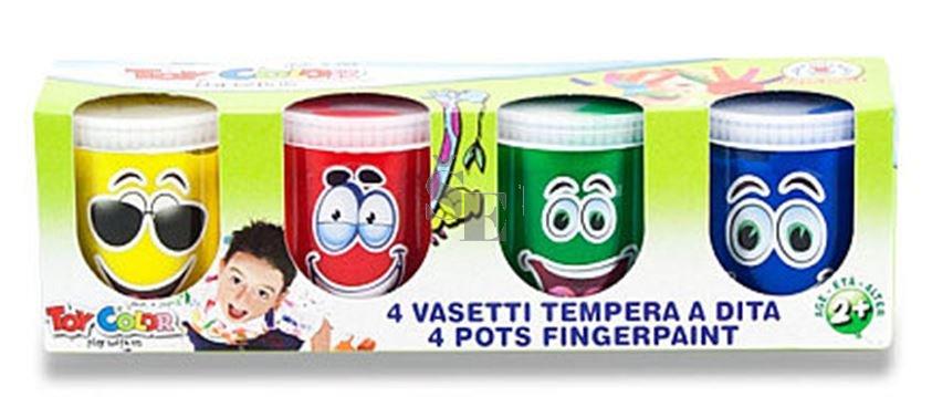 Souprava prstových barev v plastových kalíšcích. Jednotlivé barvy je možné míchat. Zasychají do 30 minut. Vypratelné z většiny běžných textilií.