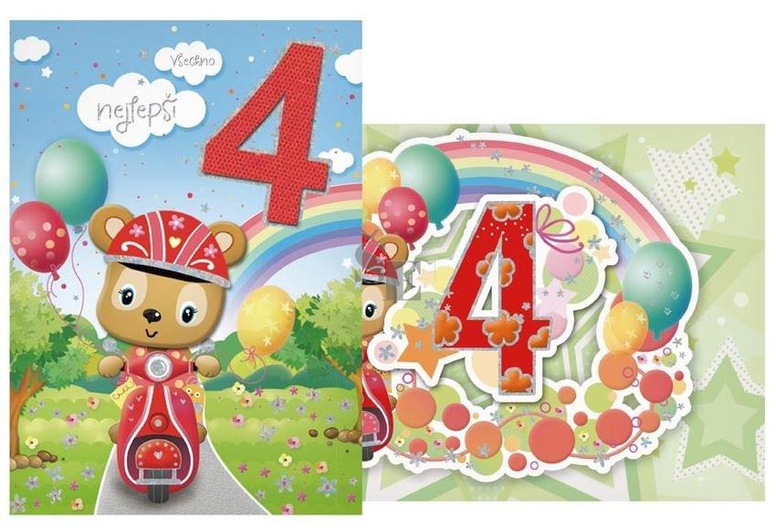 Dětské přání k 4. narozeninám s obrázkem medvídka na skútru. Oslavy narozenin patří k výjimečným a příjemným okamžikům v životě. Potěšte oslavence a spolu s dárkem mu věnujte originální a krásné přáníčko, které mu bude připomínat tuto radostnou událost.