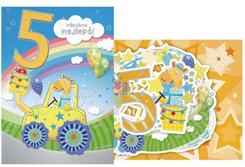 Dětské přání k 5. narozeninám s obrázkem žirafy v nakladači. Oslavy narozenin patří k výjimečným a příjemným okamžikům v životě. Potěšte oslavence a spolu s dárkem mu věnujte originální a krásné přáníčko, které mu bude připomínat tuto radostnou událost.