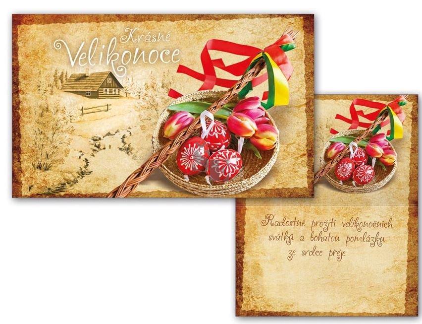 Velikonoční přání s textem uvnitř. Blahopřání s obrázkem jarní krajiny, kraslic a pomlázky.