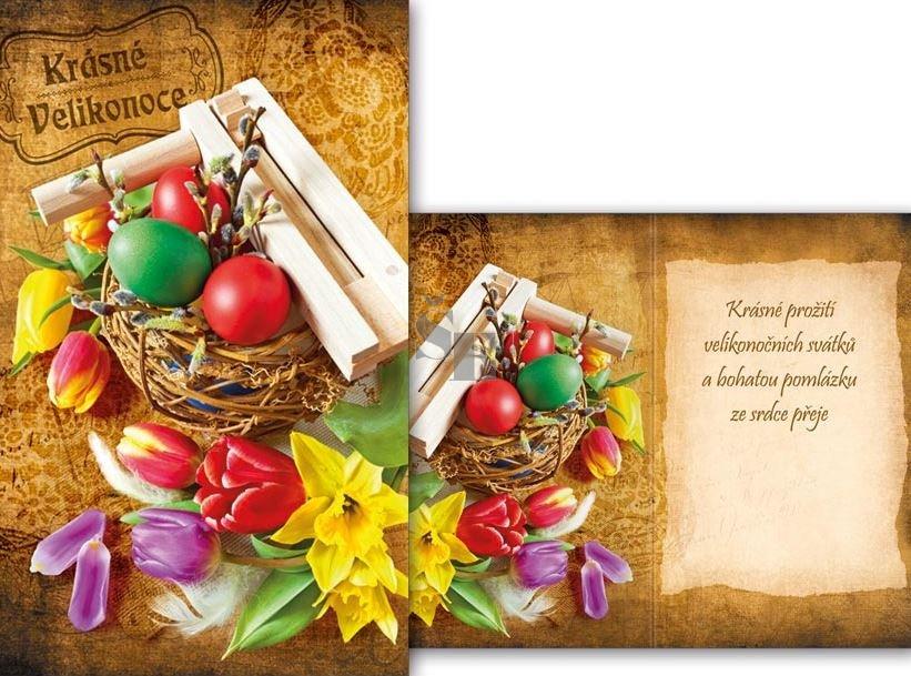 Velikonoční přání s textem uvnitř. Blahopřání s obrázkem rozkvetlých květin, kraslic a řehtačky.