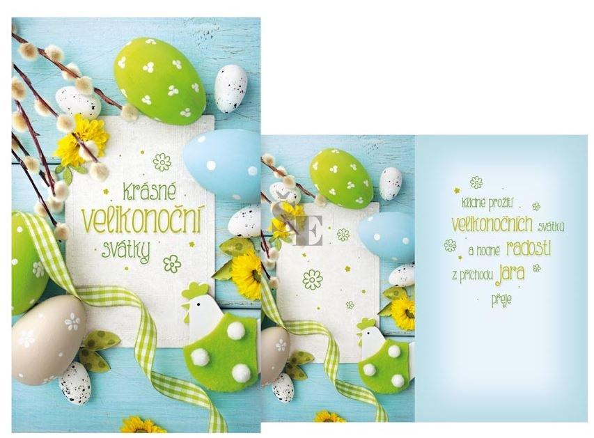 Velikonoční přání s textem uvnitř. Blahopřání s obrázkem kraslic.