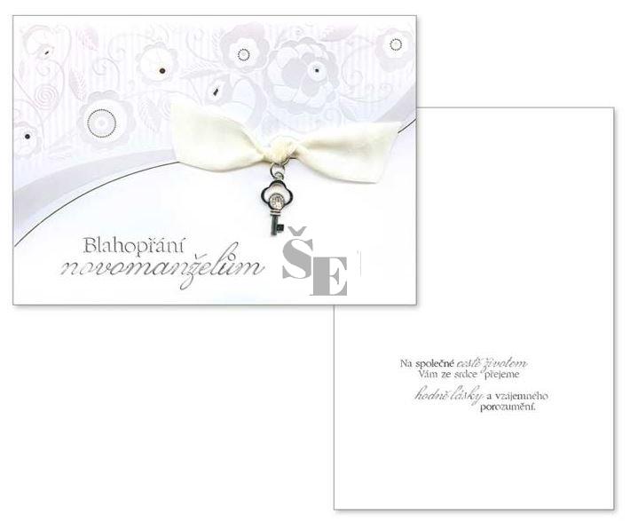 Svatební přání s textem - Svatba je příjemná a mimořádná událost a je začátkem nové etapy života. Mezi svatebními dary by nikdy nemělo chybět i přání novomanželům. Udělejte radost novomanželům a věnujte jim přání k jejich svazku, díky kterému si vždy připomenou krásné začátky jejich manželství. Nápis je vyrytý stříbrným písmem a na přání je mašlička s klíčkem.