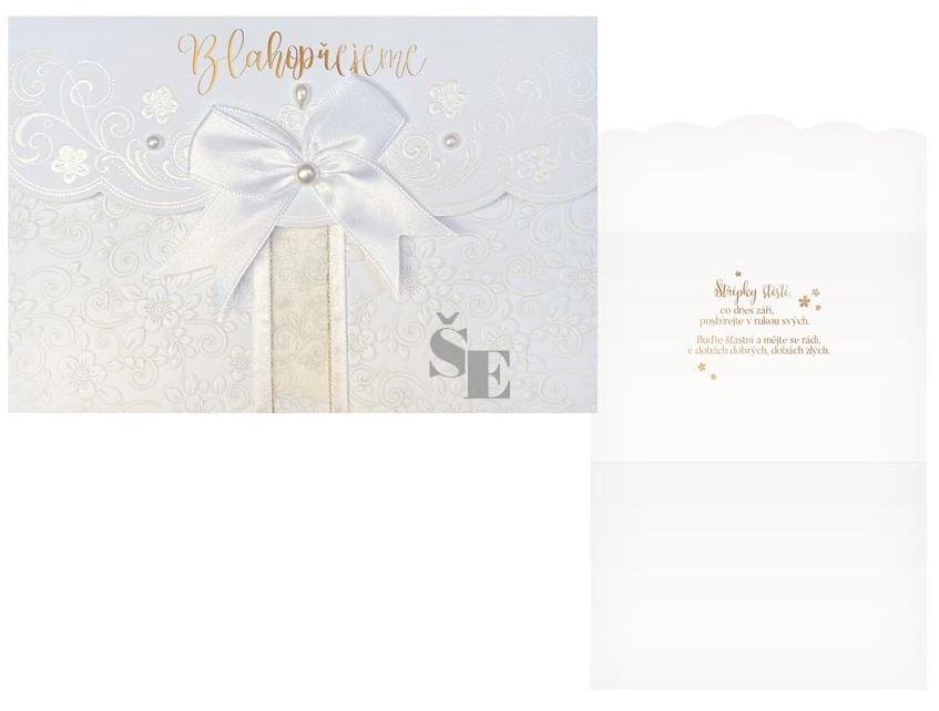 Jemná elegance a noblesa se snoubí v každém detailu tohoto přání. Zdobené embosované květinové vzory se lesknou na bílém podkladu, zatímco saténová mašle s perličkou a zlatými akcenty dodává přání punc luxusu.