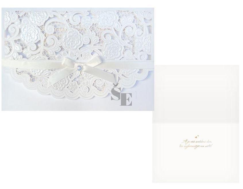 Elegantní svatební přání, které oslní svou rafinovaností a jemným designem. Bohatě zdobený krajkový motiv v kombinaci s mašličkou a perličkou dodává přání nádech luxusu a jedinečnosti. Každý detail je pečlivě zpracovaný, aby přání působilo výjimečně a nezapomenutelně.