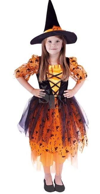 Senzační karnevalový kostým na Halloween s motivem čarodějnice v černo-oranžové barvě a velikosti S je určen pro holčičky ve věkovém rozmezí 4-6 let (105-116 cm).