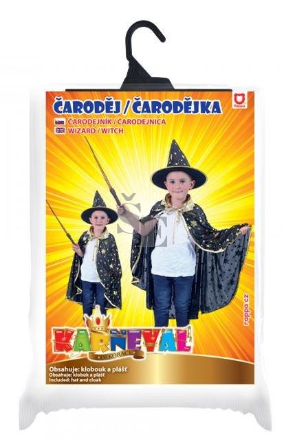 Perfektní souprava pro všechny čarodějnice nebo čaroděje na párty nebo karneval! Balení obsahuje čarodějnický plášť černé barvy se zlatým lemováním a hvězdami a perfektně sladěný klobouk. V těchto exkluzivních doplňcích tě zaručeně nikdo nepřehlédne! Určeno pro děti od 3-8 let. Délka 72 cm.