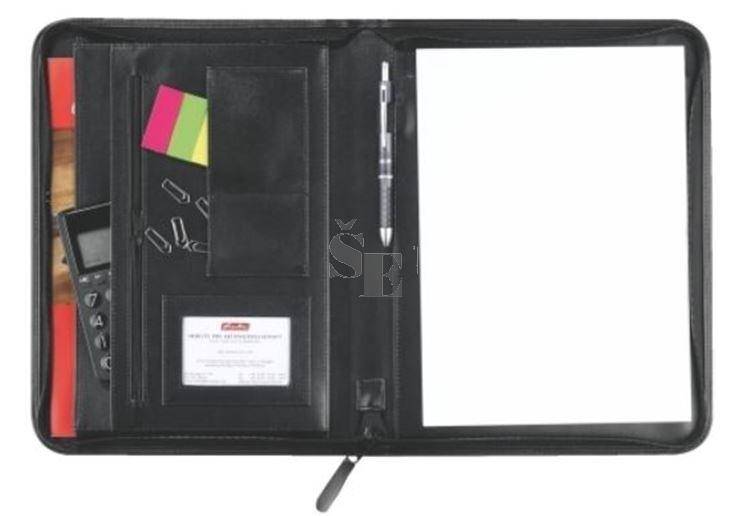 černá koženka, blok A4, různé přihrádky, poutka na psací potřeby, kapsa se zipem