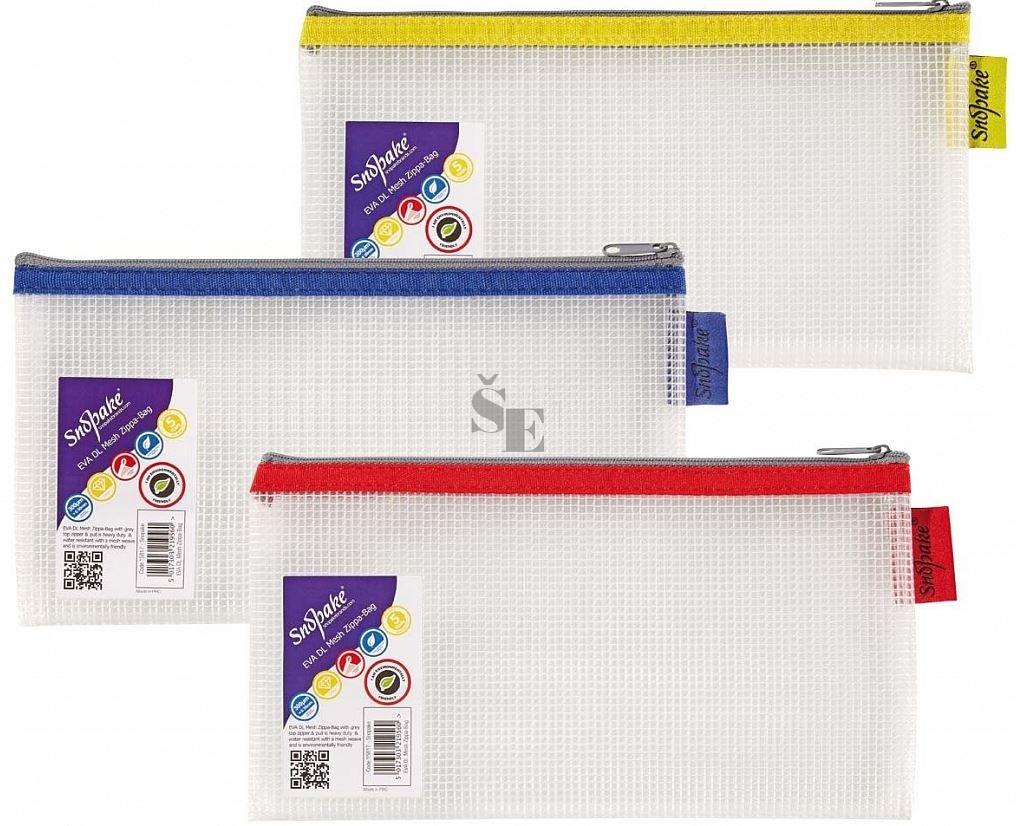 SNOPAKE EVA Mesh, zesílený síťový materiál 0,3 mikrónu, sešité rohy, voděodolný, kovový zip, barevná odlišující páska - červené, modré a žluté provedení, materiál šetrný k životnímu prostředí, rozměry 240 x 130 mm (š x v), mix barev
