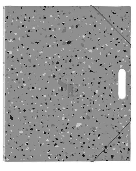 Složka na výkresy v šedé barvě s motivem imitující broušenou dlažbu s jemnými kamínky (terrazzo). Je vyrobená z kvalitního lepenkového kartonu, potaženého laminem. Uvnitř složky jsou růžky pro uchycení výkresů A4. Složka je opatřená gumičkou pro pevné uzavření a průhmatem pro snadné přenášení. Výkresy tak zůstanou neporušeny.