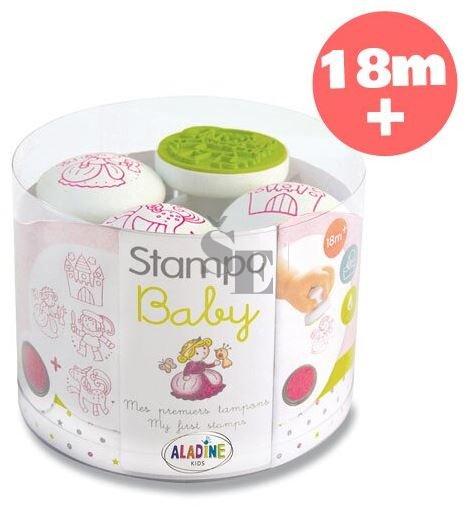 Sada Stampo Baby obsahuje 4 ergonomicky tvarovaná razítka s pohádkovými motivy a červenou razítkovací podušku s vypratelným inkoustem. Razítka mají snadný úchop pro batolata, hlubokou texturu a velký obtisk o průměru 5 cm. Razítka jsou určená pro děti už od 18 měsíců.