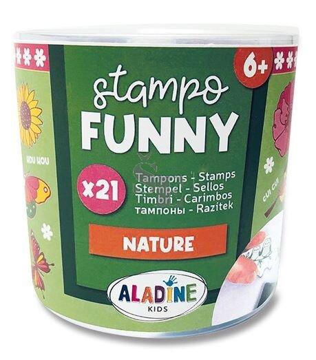 Sada tematických gumových razítek Aladine Stampo Funny na pěnové hmotě. Razítka pomáhají rozvíjet dětskou představivost, kreativitu, grafomotoriku a zručnost. Vhodné na papír, karemiku a s použitím textilní barvy také na potisk textilu.