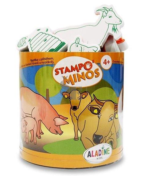 Sada Razítka Aladine Stampo Minos - Zvířátka na farmě obsahuje 23 ks různých tamponových razítek Stampo Minos a 1 podušku s černou razítkovací barvou.