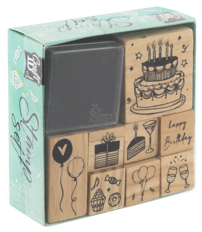 Balení obsahuje 8 ks dřevěných razítek a černý inkoustový polštářek 3,5x3,5 cm.