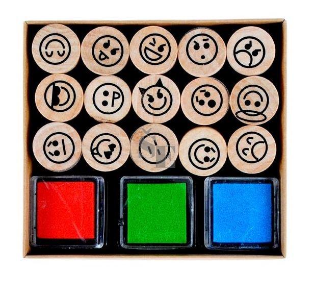 Razítka obličej dřevo 15ks + inkoust 3ks
