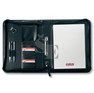 Taška se zipem A4, černá koženka, dvoukroužková mechanika, blok A4, přihrádky na kreditní karty, kapsa na zip, poutko na klíče s kroužkem, poutka na psací potřeby
