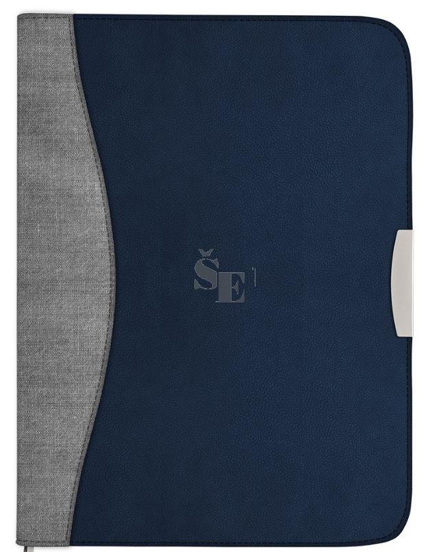Konferenční desky uzavíratelné na zip, blok linkovaný A4 s klipem, přihrádky na dokumenty a vizitky, poutko na tužku. Hřbet 30mm. Materiál PU/textil šedo-modrá.