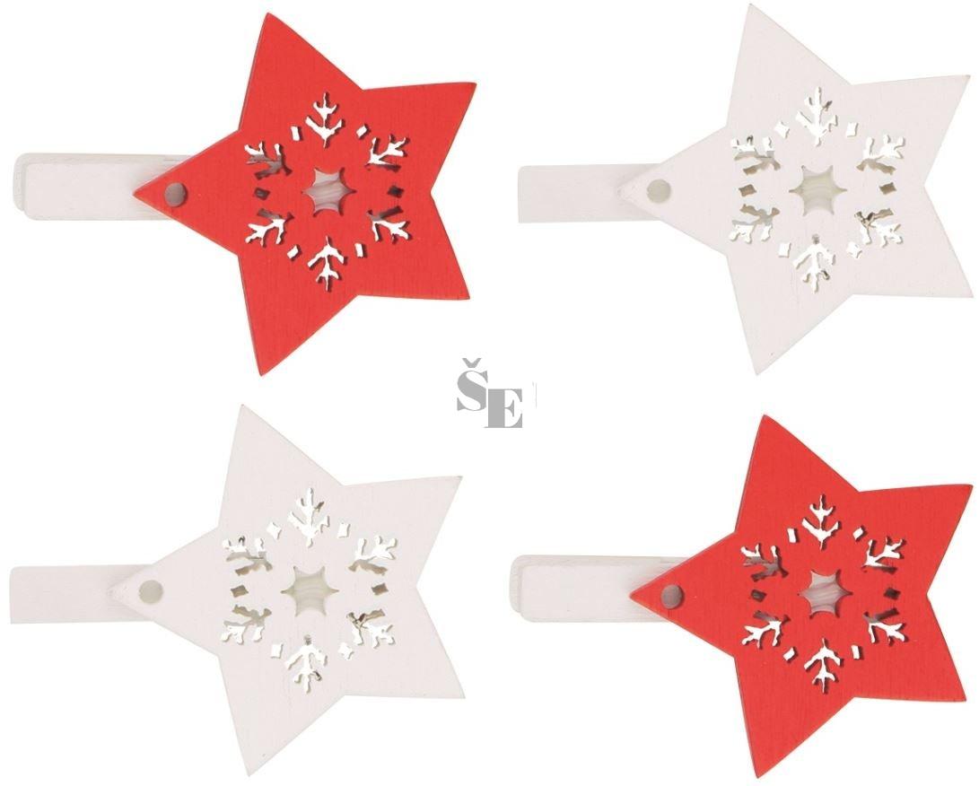 Hvězda dřevěná na kolíčku 4,5 cm, červená a bílá, 4 ks