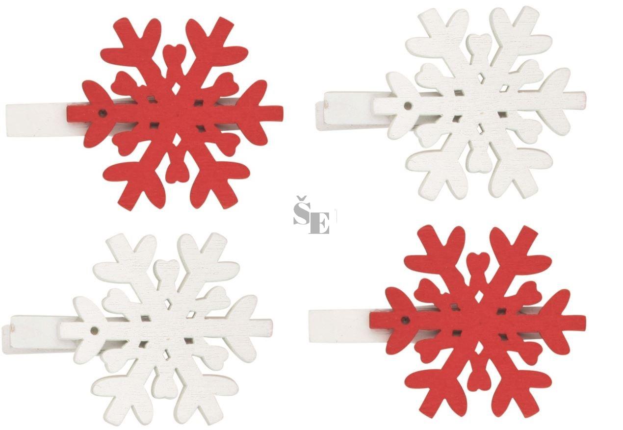 Vločka dřevěná na kolíčku 4,5 cm, červená a bílá, 4 ks