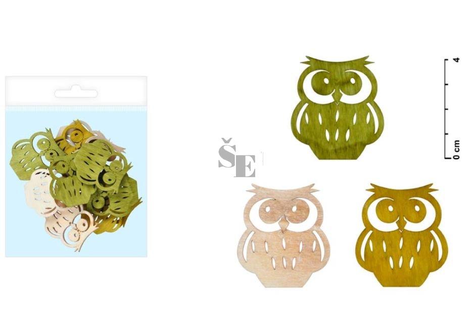 Dřevěná dekorace - sova. Set 12ks vyřezávaných soviček v zelené, žluté a světle hnědé barvě. Vyrobeno z překližky. Vše je zabaleno v sáčku se závěsem.