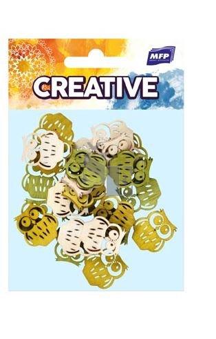 Dřevěná dekorace - sova. Set 24ks vyřezávaných soviček v zelené, žluté a bílé barvě. Vyrobeno z překližky. Vše je zabaleno v sáčku se závěsem.