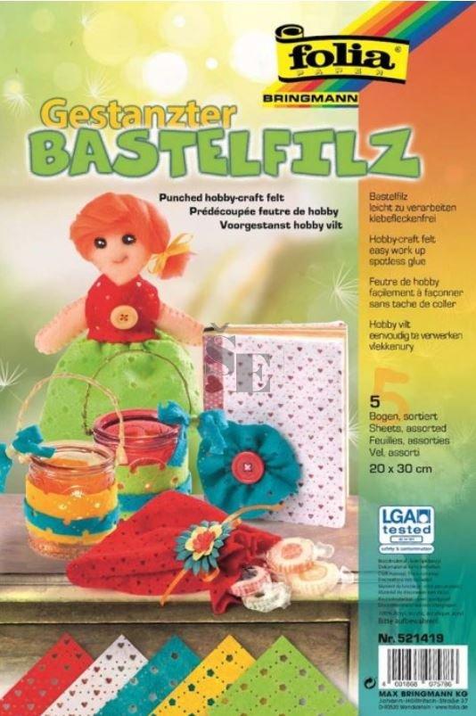 Děrovaný filc o velikost 20x30 cm. Balení obsahuje 5 ks filcu zelený, žlutý, modrý, bílý a červený s výseky srdíček a kytiček