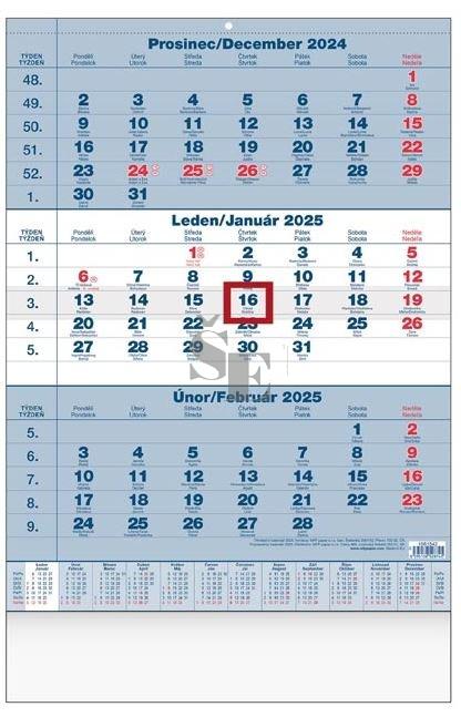Nástěnný kalendář na rok 2026. V tomto kalendáři jsou zobrazeny tři měsíce na jednom listu. Vhodný k organizování různých událostí každodenního života. Možnost dotisku firemního loga a textu na spodní stranu kalendáře.