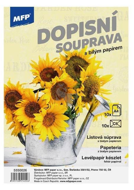 Dopisní souprava obsahující 10 potištěných papírů a 5 bílých obálek.