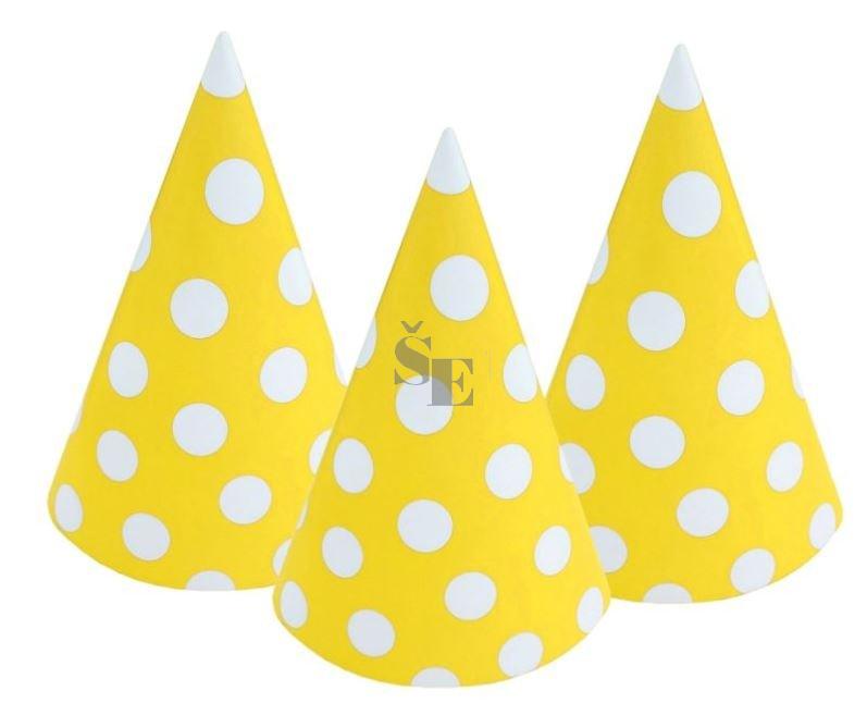 Jednobarevné, papírové čepičky s bílými puntíky.