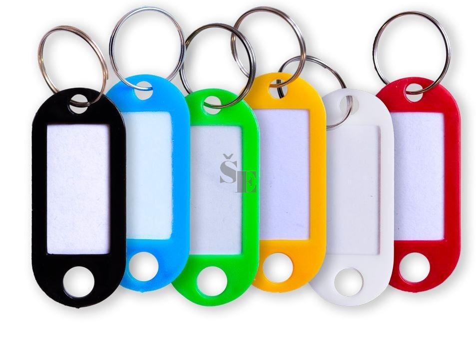 Plastové jmenovky na klíče s popisným štítkem s kovovým kroužkem pro uchycení klíčů. Jmenovka má i druhý otvor pro uchycení dalšího klíče nebo například přívěsku.