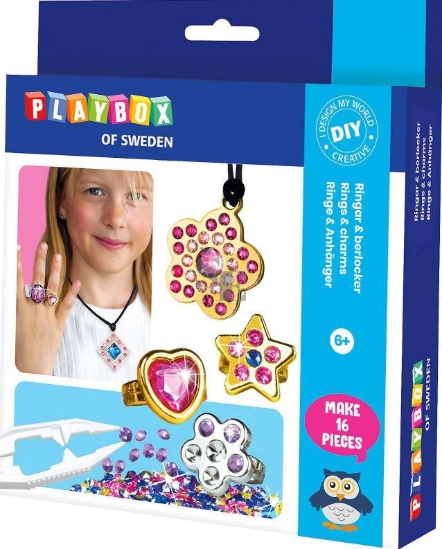 Balení obsahuje: 8 prstýnků + 8 přívěsků různých tvarů, 1000 ks kamínků různých barev a tvarů, pinzetu a lepidlo.