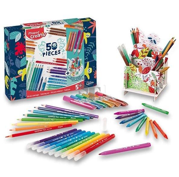 Kufřík Maped Creativ s výtvarnými potřebami v přitažlivé paletě barev obsahuje 16 pastelek, 12 fix, 6 lepidel se třpytkami a 16 voskovek. Součástí kufříku je i kartonový box k vybarvení, který lze použít například jako stojánek na tužky a pastelky.