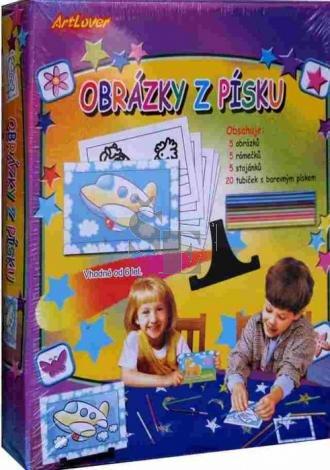 5 obrázků se stojánky a rámečky, 20 tubiček s barevným pískem. Odlepíte folii z políčka, nasypete písek a pokračujete dokud není obrázek hotový. Pak jen přidáte rámeček a máte hotovo.
