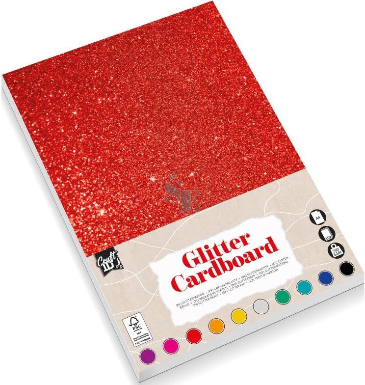 Balení obsahuje 10 listů třpytivých papírů A4 (21 x 29,7 cm) s gramáží 200 g/m2 - červená, stříbrná, růžová, zlatá, oranžová, zelená, modrá, tm. růžová, tm. modrá, černá.