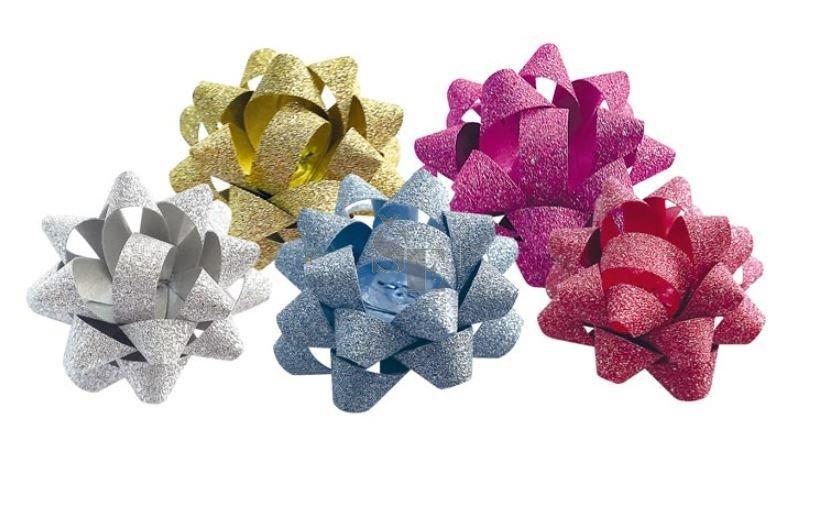 Glittrová rozetka neboli kokarda. Ideální pro moderní ozdobení dárku. Rozetka má na spodní straně lepící pásku pomocí které ji připevníte na krabičku.