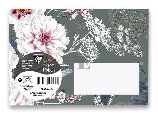 Barevné obálky Clairefontaine Botanic Garden v atraktivním designu, formát C6 (114 x 162 mm), 120 g. Balení obsahuje 20 ks obálek.